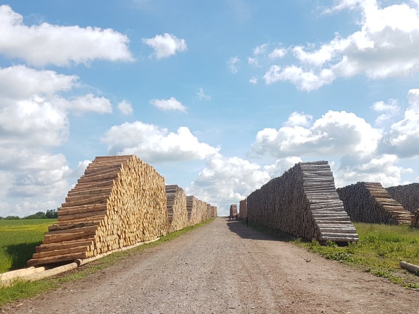 In der Ferne begrüßen uns Pyramiden, wir können den Blick nicht von den großen Gebilden lassen, die sich aus der Nähe als riesige Holzstapel entpuppen. Hier muss ein ganzer Wald gerodet worden sein.