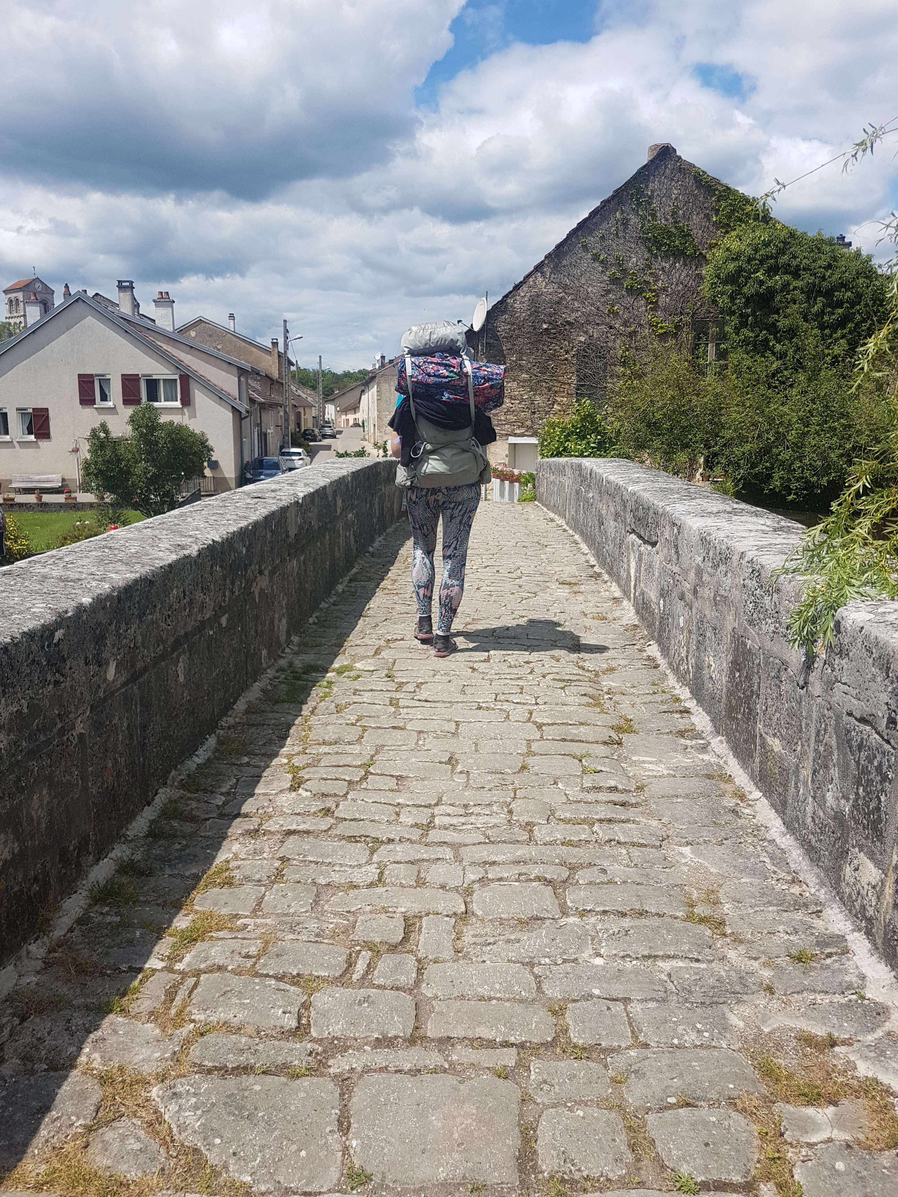 Der Pilgerweg, klar beschrieben als nach rechts führend, wird wegen der historischen Brücke von uns übersehen. Diese sieht so einladend aus, dass wir sie alle einmal überqueren wollen. Wieder auf dem rechten Weg durch weitläufige Wiesen und Waldlandschaften, vorbei am Abbaye de L’Étanche, erreichen wir das Hotel La Frezelle in Rouvres-la-Chétive.