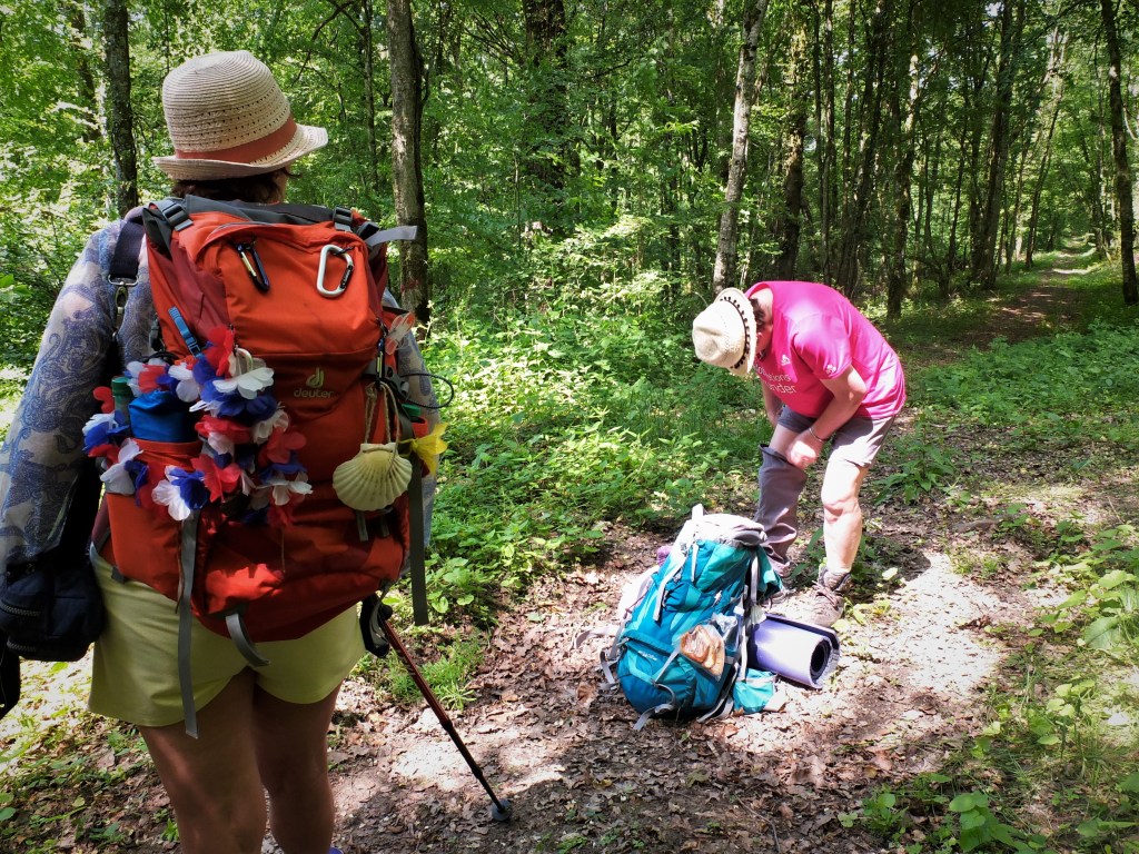 Da sind sie wieder, die Auf- und Abstiege. Vom Campingplatz aus suchen wir zunächst die Kirche von Bourbonne-les-Bains auf. Sie hat eine sehr schöne Atmosphäre. Direkt am Eingang ist Weihwasser in einer schönen, großen Muschel. Der Kurort hat alles, was man sich davon verspricht. Interessante Häuser, erfrischende Wasserfontainen, alte Bäume mit wunderbaren Dächern aus Blättern – und viele Geschäfte. Nein, wir dürfen nicht shoppen. Es geht weiter, und da haben wir sie wieder, die Höhenkilometer. Es geht behäbig bergauf. Dem Reisebuch war bereits zu entnehmen, dass die Strecke mitunter matschig ist. Das können wir nur bestätigen. Nach vielen Kilometern kommen wir an eine Weggabelung. Wir suchen den richtigen Weg und wünschen uns an dieser Stelle eine “Couquille”. Wo geht es weiter? Wir schwärmen in verschiedene Richtungen aus, um den Wanderweg 817 zu finden. Mit Vor- und Nachhut schaffen wir es nach einiger Zeit, den richtigen Pfad zu finden. Froggy und Fijula bleiben etwas zurück, weil sich Froggy noch die Beine anziehen muss, damit sind die Beine ihrer Freizeithose gemeint. Es findet folgender Dialog statt: “Ich habe Beine, ich hab´sie nur noch nicht fest gemacht!” Die Beine dienen insbesondere dem Schutz vor Zecken und weiteren Vierbeinern. Ein wenig später sagt Froggy zu Oleander: “ Kannst Du noch mit den Stöcken laufen, sonst lass ich meine Beine fallen und nehme die Stöcke.” Das nennt man Pilgerehre.