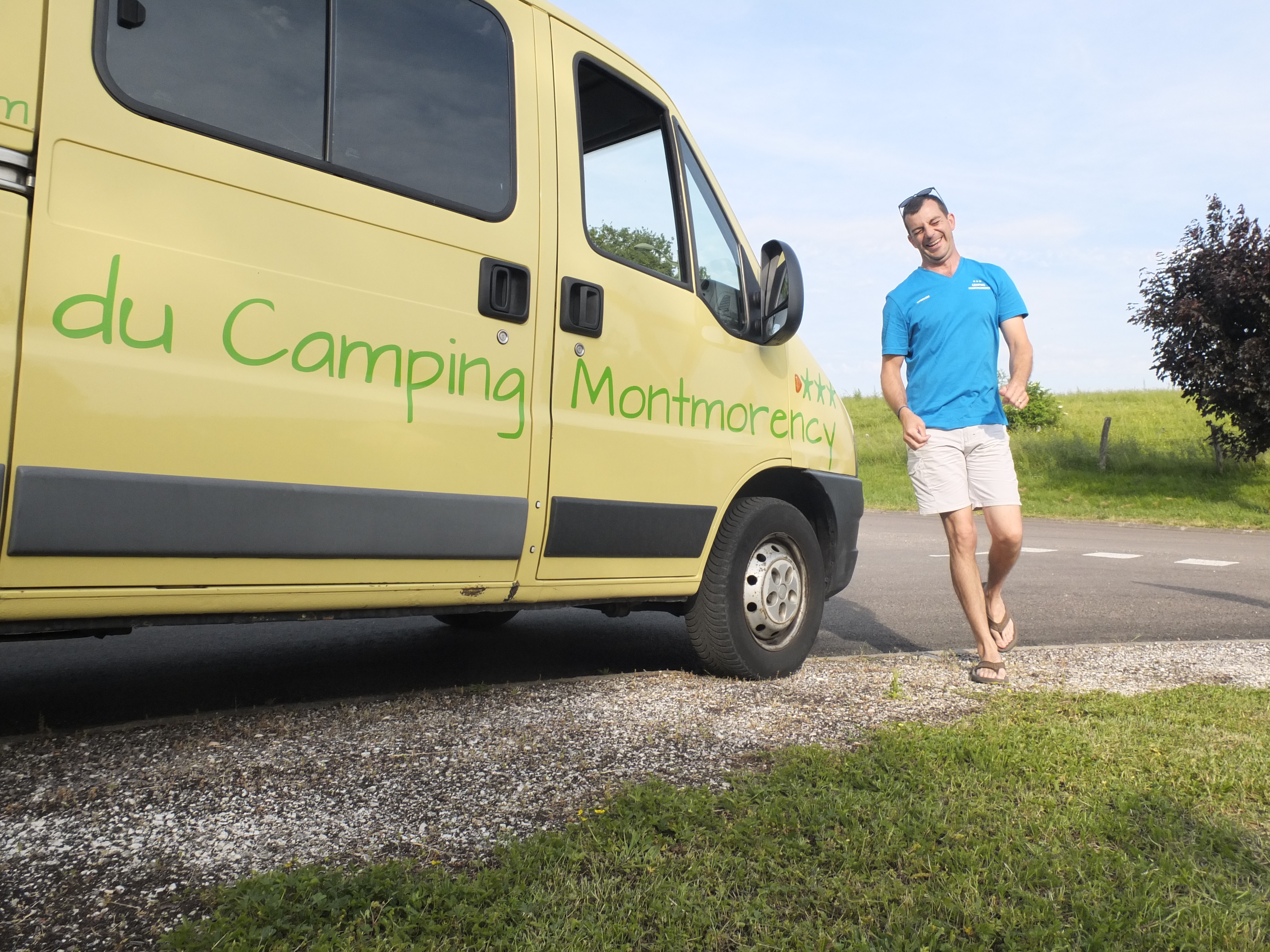 In Chézeaux angekommen, eilen wir in Richtung Kirche. Noch davor an einer Weggabelung gehört der erste Schatten uns. Wir entledigen uns unserer Rucksäcke und Chora pflückt Kirschen für alle. In dem Moment sehen wir diesen wunderbaren gelben Reisebus vom Campingplatz Montmorency. Steeven öffnet uns die Beifahrertüre, wir sind sehr glücklich über diese Fahrt nach Hause, direkt vor die Türe. Das Radio läuft: “It never rains in California!” Ein fünfstimmiger Chor ertönt und Steeven grinst charmant.