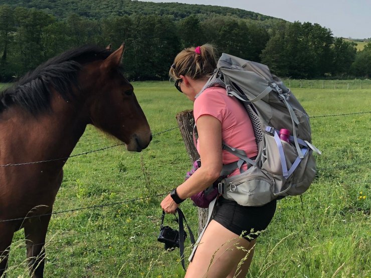 Auf dem Pfad der Tugend geht es weiter, Kilometer für Kilometer. Wir laufen in Richtung Zivilisation. Die “aufmerksamen“ Pferde und Kühe der Vogesen begrüßen uns mit offenen Augen und kommen auf uns zu. Da wir eine feste Verabredung mit unserem Fahrer haben, der uns um 18:30 Uhr am Zielort abholen wird, müssen wir Tempo machen. Froggy kann nicht verstehen, dass wir in aller Ruhe auch noch ein Pferd streicheln.