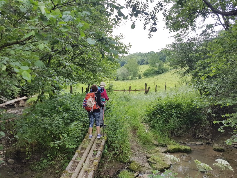 Diese Pause wird die letzte für vier Stunden sein, aber das wissen wir zu diesem Zeitpunkt natürlich noch nicht. Wir nehmen das Marschgepäck wieder auf und wandern durch die Ortschaft. Wie ausgestorben. Dabei verpassen wir die Abzweigung, die uns in den Wald führen soll und laufen bereits aus dem Dorf hinaus. Koshi ist ziemlich entschlossen, nicht wieder umzukehren und würde den Fahrradpilgerweg bevorzugen. Die Truppe fängt sie wieder ein. Wir kehren zurück und ein kleiner Pfad zwischen Häusern tut sich auf. Der Weg geht bergab in verwunschene Landschaften, schmale Pfade mit hohem Gras. Es dauert ewig, bis eine Muschel erscheint. Bis dahin treffen wir auf Spuren von Tieren auf ausgetrockneten Böden. Viele kleine Schritte sind zu tun. Für den einen ist die Landschaft reizvoll, für den anderen sind die Wanderbedingungen anstrengend. Nach langer Wanderung durch unberührte Fauna fokussieren wir unsere Kräfte auf das Erreichen eines Kleinods – die Chapelle de Presles, die irgendwie laut GPS scheinbar immer wieder einen Kilometer entfernt liegt. Zwei von Fünfen erreichen das Ziel. Drei von Fünfen kapitulieren 200 Meter vor der Chapelle de Presles und legen sich erschöpft mitten auf dem Waldweg nieder.