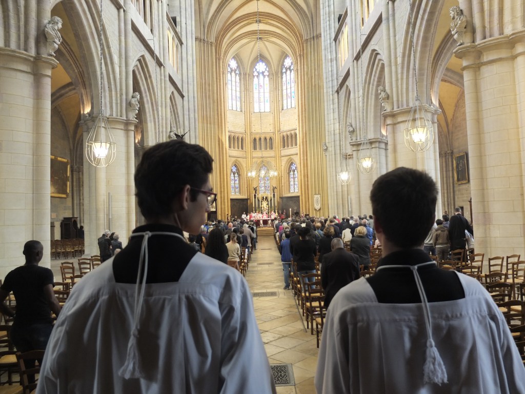 Auf mit dem Zug nach Dijon. In der großen Stadt angekommen, orientieren wir uns, wie immer, am Kirchturm. Wir erreichen die Cathédrale St.- Bénigne, öffnen die Kirchentür und tauchen ein in wunderbare Chorgesänge. Die Messe wird gerade gelesen. Welch ein spiritueller Moment. Messdiener schreiten während des Gottesdienstes mit getragenen Schritten und brennenden Kerzen den mittleren Kirchengang entlang. Sie nähern sich uns, stellen die Kerzen ab und reichen uns die Hände. Zum Ende des Gottesdienstes schreitet auch der Bischof an uns vorbei und segnet uns.
