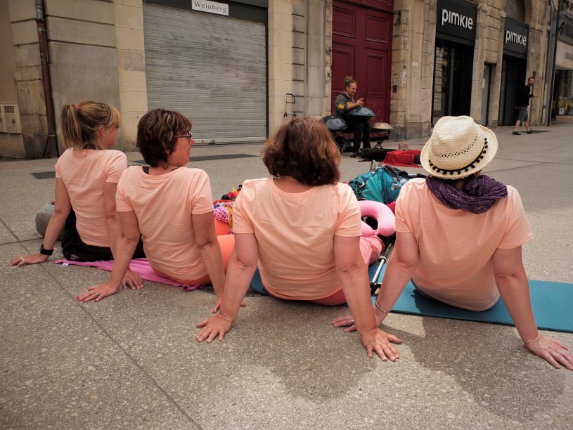 Noch vor der Eglise Notre-Dame de Dijon hören wir bezaubernde Klänge, die Koshi bekannt vorkommen. In der Heimat hat sie diese Töne schon einmal gehört. Ein Straßenmusikant spielt virtuos ein ganz besonderes Musikinstrument, eine „Handpan“, und bewegt im Takt dazu seinen rechten Fuß, der mit einer Muschelkette versehen ist. David, so der Name des Musikers, entführt die Passanten in eine andere Welt. Auch wir legen unser Marschgepäck ab und lauschen den Klängen.