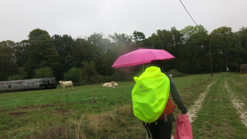 Wir erwachen im Maison forestière de Charbonnières und leider ist Fijula etwas malade. Nach einem sehr einfachen Frühstück verabschieden sich drei von fünfen von dem sehr netten Jean-Yves und machen sich zu Fuß auf den Weg nach Vivey. Fijula und Chora werden von ihm zur nächsten Unterkunft gefahren. Il pleut, es regnet mal wieder. Auf den Schrecken, dass unsere arme Fijula nicht mit uns laufen kann, genehmigen wir uns nach knapp 100 Metern zunächst einen Pilgergeist zur inneren Desinfektion. Danach geht alles gut. Die Pilze sind lila, echt! Und es regnet, hatten wir das schon erwähnt?