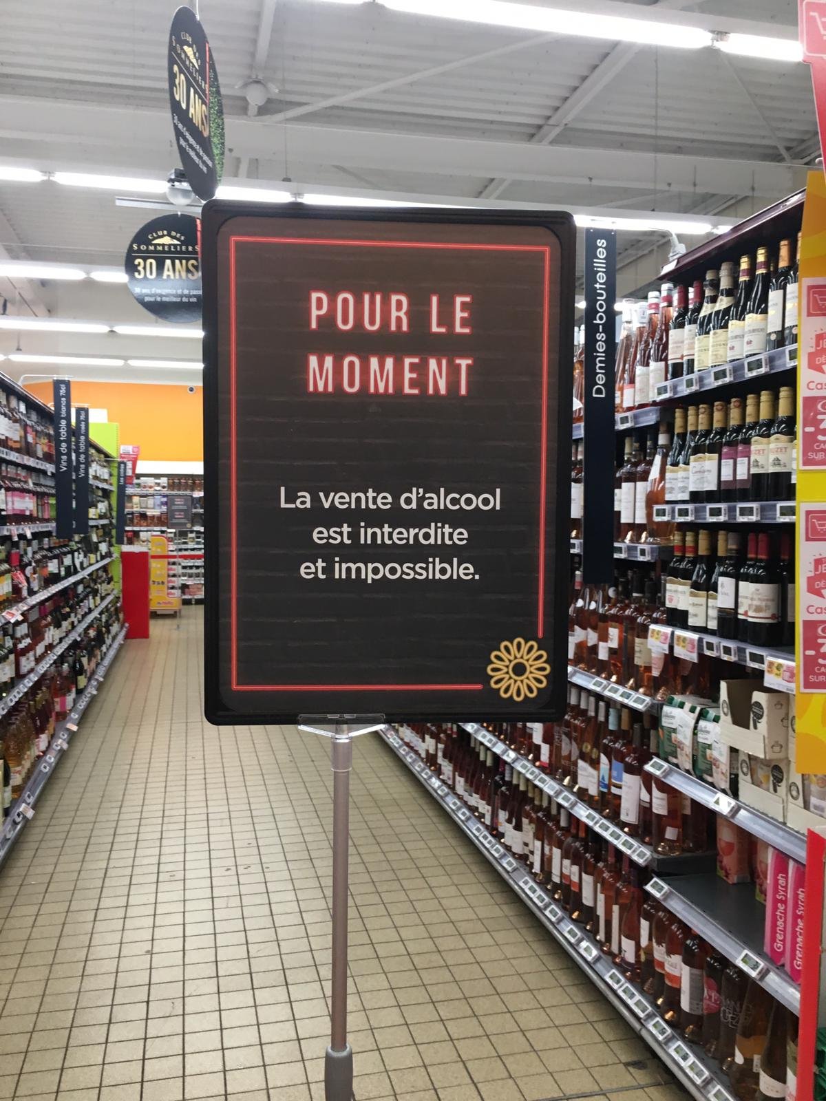 Der Supermarkt hat bereits ein Verbotsschild aufgestellt, die Abgabe von ALKOHOL ist verboten.