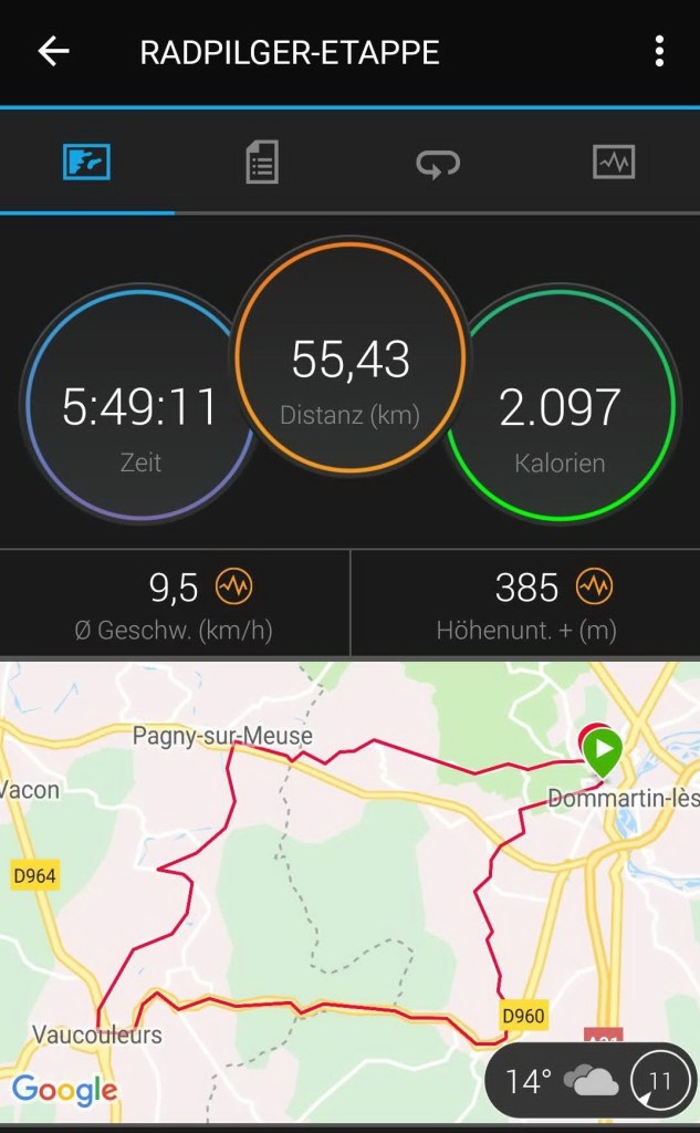 Ach, was bin ich froh, dass ich wieder heil in Toul angekommen sind. Mein Fahrrad ist ohne Rücktrittbremse. Für viele kein Problem – aber für mich! Deshalb sind die vielen Kilometer nicht körperlicher (auch), sondern mehr mentaler Stress. Ich bremse immer ins Leere und dann erst mit den Händen… Im Flachland hätte ich dieses ängstliche Gefühl noch kompensieren können, aber hier ist Berg- und Talfahren angesagt. Ein beruhigendes, aufmunterndes Wort der anderen hätte mir bestimmt gut getan, jedoch mussten wir immer schön hintereinander fahren.