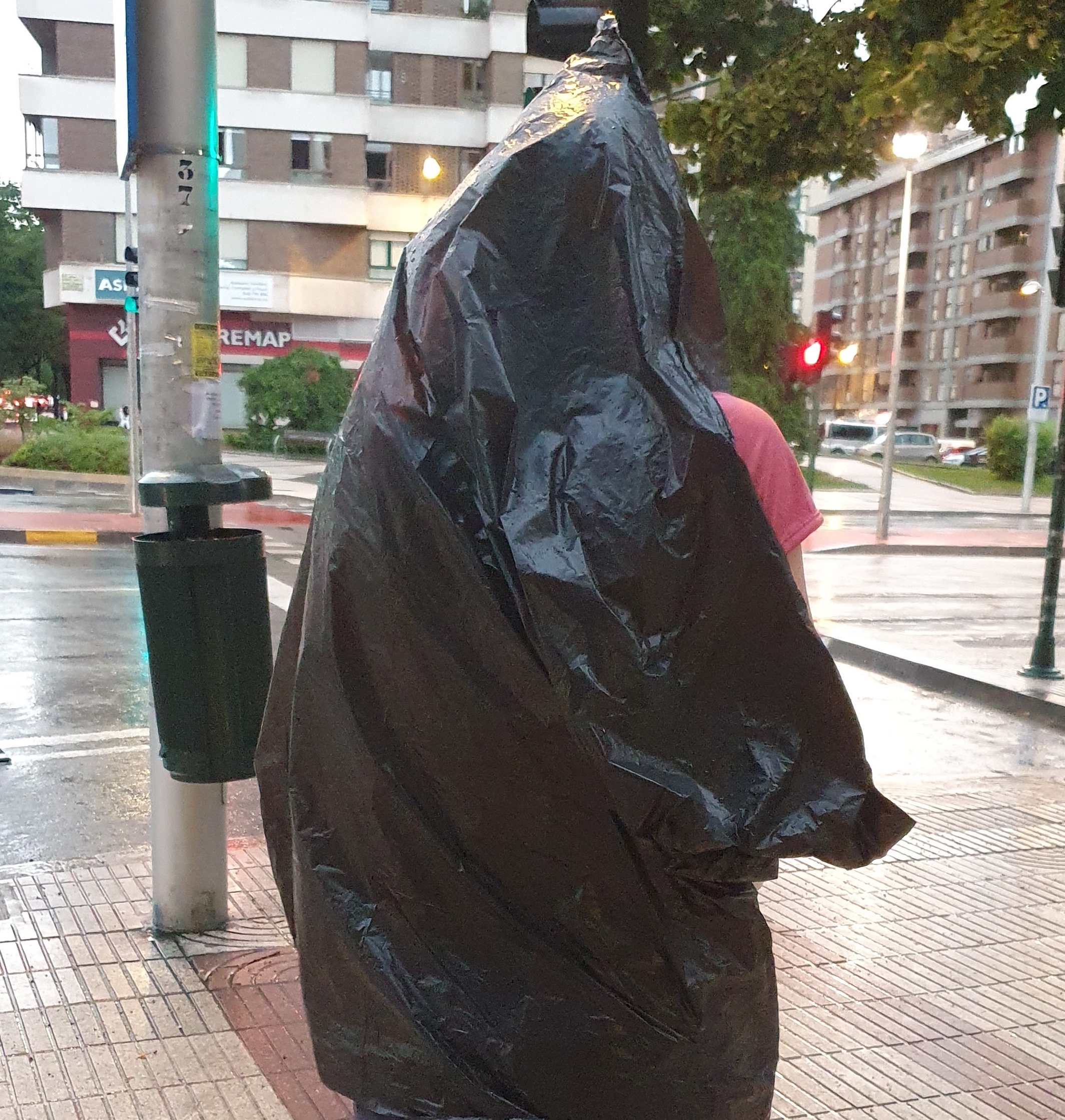Lachend kreieren wir uns ein chices Regenoutfit – sogar mit Kapuze.