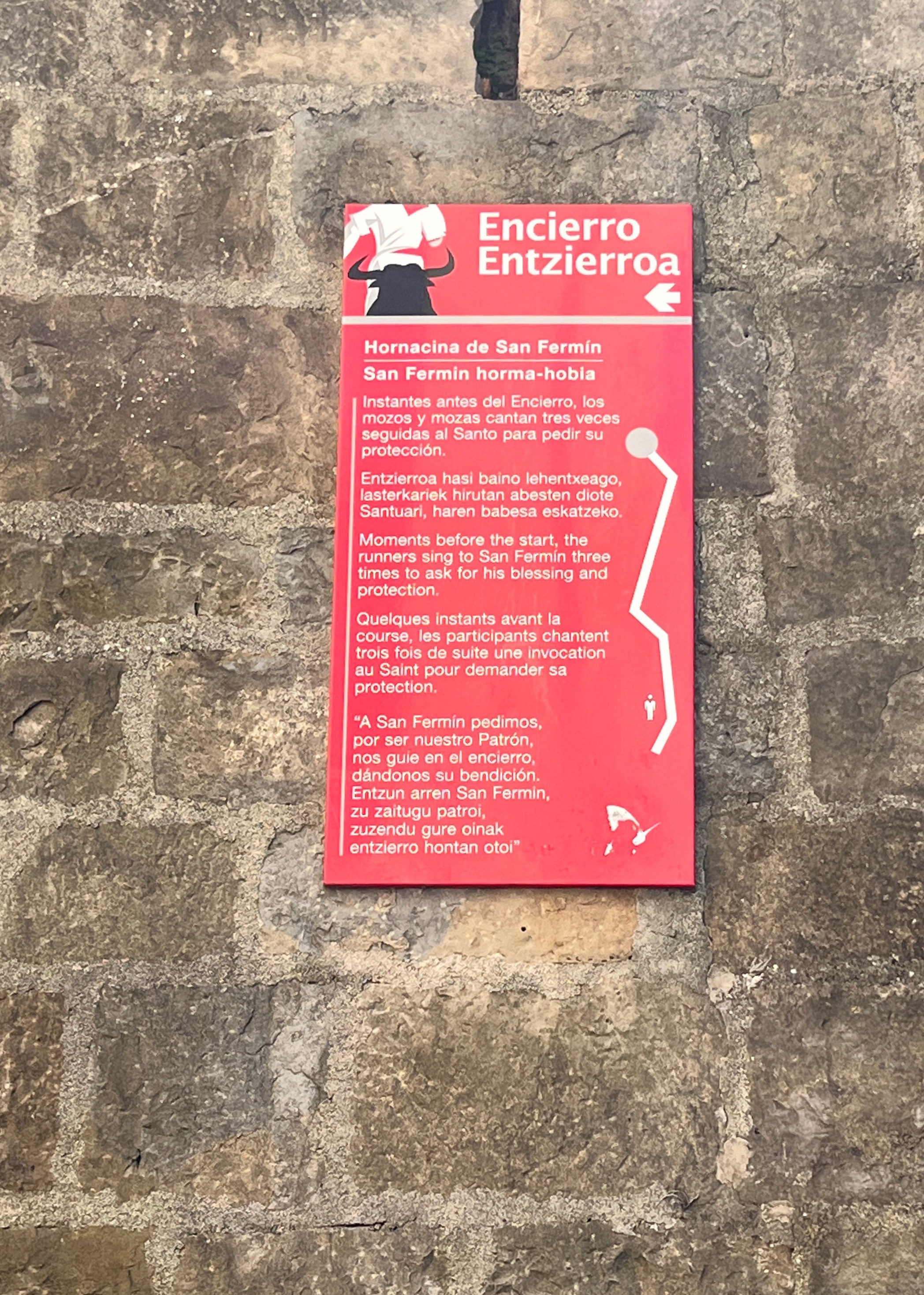 Überall in Pamplona trifft man auf die unübersehbaren Zeichen der größten und umstrittensten Attraktion der Stadt – dem Stiertreiben. Es ist Teil der Sanfermines. Das Fest zu Ehren von San Fermin – ein Heiliger und Sohn der Stadt. Alle tragen weiße Kleidung mit roten Halstüchern und feiern 1 Woche lang.Wir streifen durch die Stadt auf historischen Pfaden. Wollen die Kirche besuchen, die uns mehrsprachig begrüßt, aber sie ist cerrado. Potzblitz!