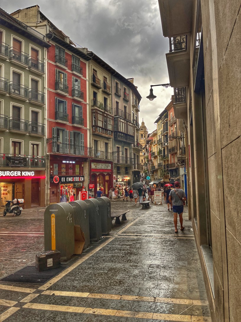 Raus aus dem Laden und hinein ins Unwetter. Ein Gewitter geht auf Pamplona nieder. Donner und Blitz! Potzblitz!