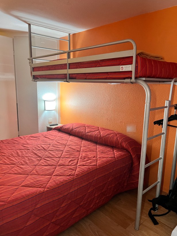 Da haben wir uns Wochen und Monate mit dem Gedanken auseinandergesetzt, wie wohl die Herbergen mit 20 Betten und mehr so aussehen könnten… und erleben, dass ein Hotel (Première Classe mit 40 Euro die Nacht) unsere schlimmsten Erwartungen übertrifft. Diese Nacht werden wir auf jeden Fall niemals vergessen.
