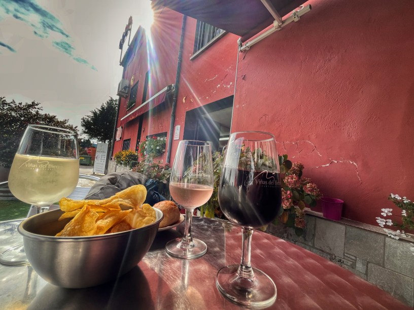 Als ich zurückkomme, serviert die Frau 2 Gläser Wein, zwei Chorizowurst-Stücke in Brot und eine Schüssel Chips. Wir staunen, denn das alles gibt es für nur 1,50 Euro.