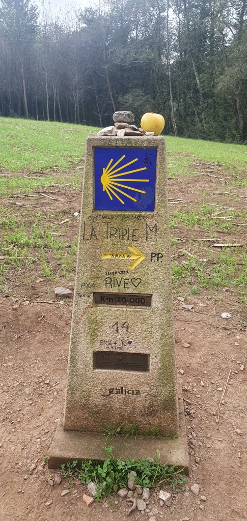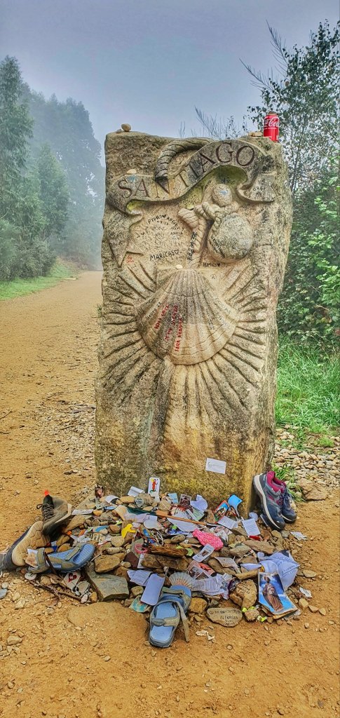 Auf den letzten Kilometern sehen wir immer häufiger Gedenkstätten, an denen Pilger ihre Gedanken und Wünsche platzieren. Manche finden wir in Form von Briefen, Notizen und Fotos, aber auch Schmuckstücke und Figuren sehen wir. Andere lassen ihre Schuhe zurück.