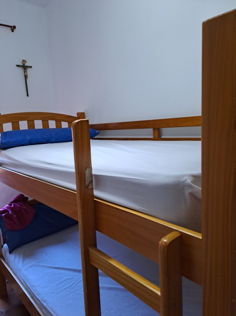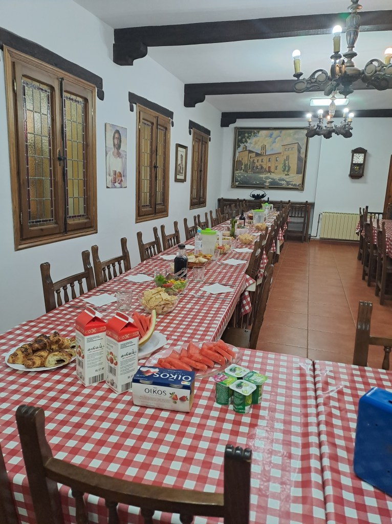 Doch es bleibt keine Zeit, das Gebäude zu bestaunen, da ein Bruder der Maristenfamilie uns in den Eingang zieht. Wir sollen schnell unsere Wanderschuhe ausziehen, die Rücksäcke und Wanderstöcke ablegen und uns setzen. Der Bruder drückt uns ein Glas Wasser in die Hand. Wir seien bestimmt durstig, so sein Kommentar. Er setzt eilig an, uns die Spielregeln des Hauses zu erläutern. Zunächst einmal erkundigt er sich nach unseren Pilgerpässen plus Personalausweis. Es muss schließlich alles seine Ordnung haben. Dann erhalten wir die Einmalbettlaken verbunden mit der Bitte, diese am nächsten Morgen in den Körben zur linken Seite wieder abzugeben. Heute Abend hätten wir die einmalige Gelegenheit, an einem Austausch der Pilger über ihre Erfahrungen auf dem Weg und / oder an einer Messe am frühen Abend und / oder an einem Abendmahl teilzunehmen. Wir müssten uns wohl schnell entscheiden und eintragen. Das Essen sei was ganz Besonderes, weil…