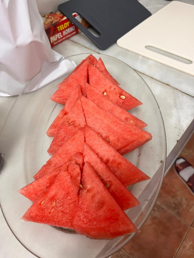 Da es so heiß ist, bringen wir Melone ins Spiel. Da ist unser Bruder hellauf begeistert. Ein Mitbruder könne diese wunderbar dekorieren. Er schneidet Tannenbäume aus Ihnen. Leider sei er nicht da. Tannenbäume halten wir im September für etwas verfrüht, aber wir werden eine andere Variante finden.
