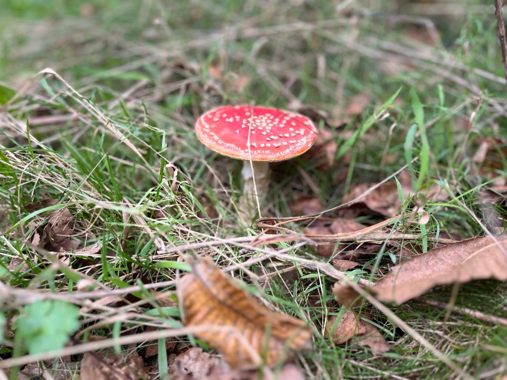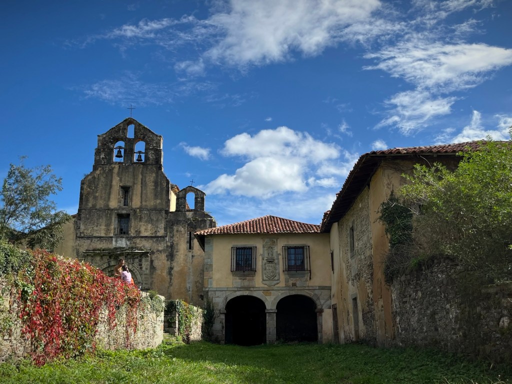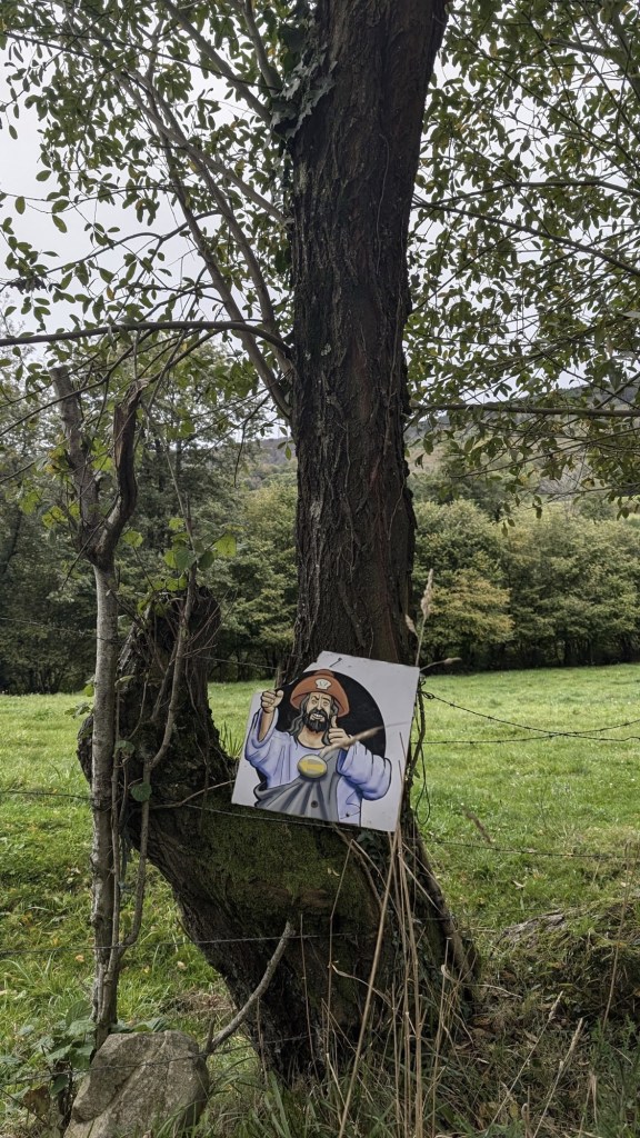 Der Regen streift uns in vereinzelten Schauern, aber sie sind kaum wahrnehmbar. Wir laufen durch sonnige Wiesen und Waldwege. Pilze sind die einzigen Hinweise auf die herbstliche Jahreszeit. Am Ende eines Waldweges kommen wir zu einem Abzweig. Der Jakobsweg macht einen Knick und geradeaus geht es zu einer Klosterruine. Das Besichtigen der Klosterruine würde uns 500 Meter vom Weg abbringen, da siegt die Neugier.
