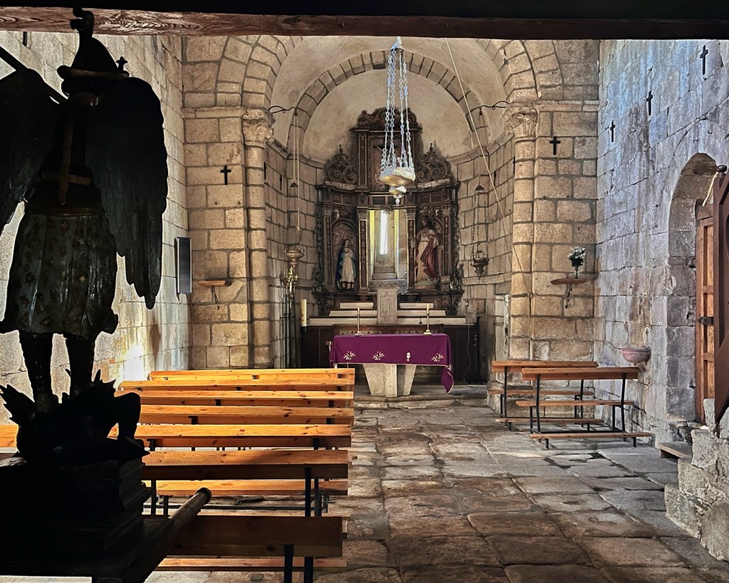 Schweigend kämpfen wir uns Stunde um Stunde voran. Wenn man motivational und auch sonst durchhängt, ist stundenlanges Asphalttreten ein Multiplikator für die Verzweiflung. Gelegentlich führt die Strecke runter von der Straße durch ein Waldstück. Einmal kann man durch eine kleine Investition von 600 Metern auch noch eine Kapelle besuchen. Fleur und ich sind dankbar für die Abwechslung, auch wenn es die Strecke verlängert.