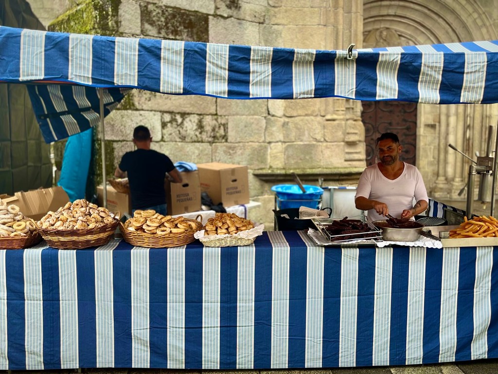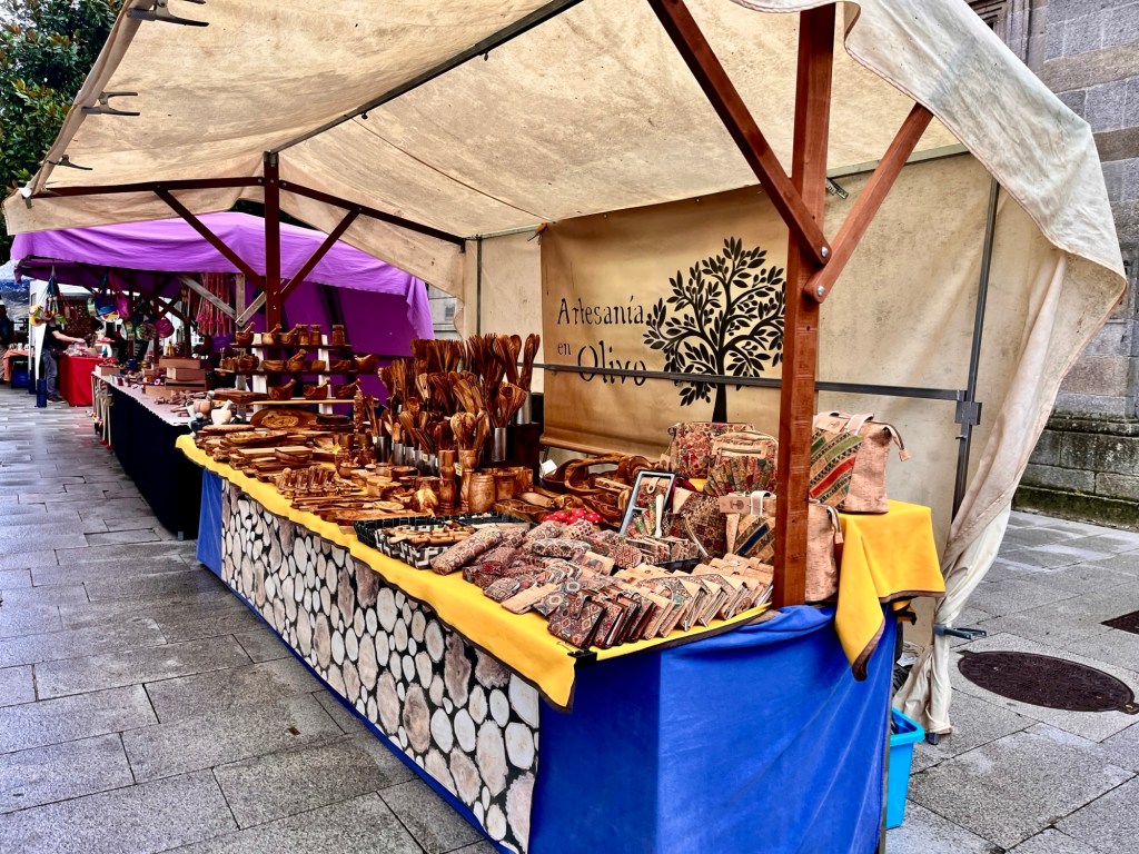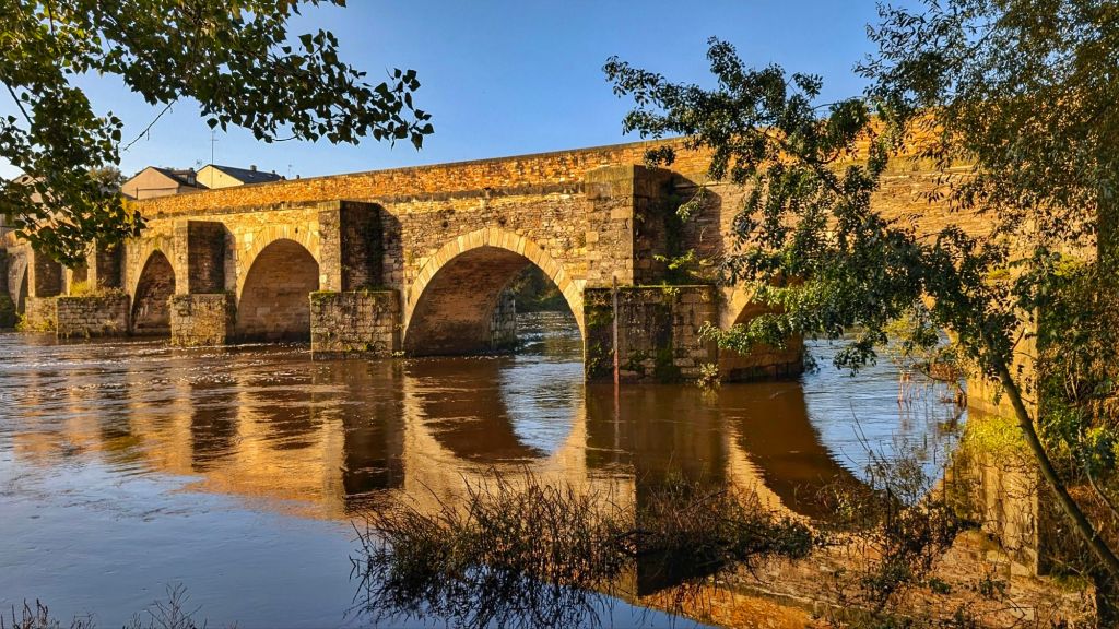 Leider müssen wir die Stadt nach einem Besuch der Kathedrale verlassen, denn es liegen wieder 30 Kilometer zwischen uns und unserem Ziel Ferreira. Wir schlendern noch etwas über den Mittelaltermarkt, der gerade aufgebaut wird und bewundern die angebotenen Köstlichkeiten. Dann geht es durch das Stadttor hinaus und über die historische Brücke, Puento Romano, erstmal steil bergauf.