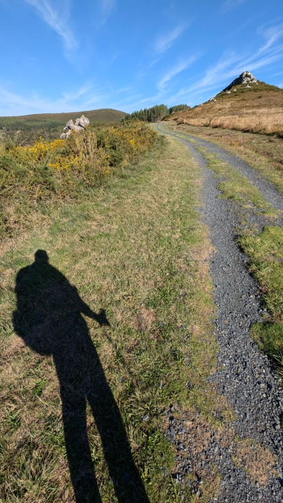 Ich bin sogar so vertieft darin, dass ich die Kirche verpasse. Ich brauche ein neues, erreichbares Ziel, damit ich die Strecke gedanklich einteilen kann. Zunächst einmal geht es über den Pass, die Sonne scheint und mein Schatten läuft vor mir her. Mein neues Etappenziel erscheint ganz unvermittelt hinter der nächsten Kurve.