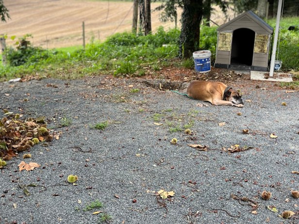 Wir erreichen ein Restaurant/Café, vor dem mehrere Tische mit bekannten Pilgern, aber auch vielen fremden Gesichtern belegt sind. Der einzige freie Tisch befindet sich direkt neben der Hundehütte und zugehörigem Hund. Ich betrachte die Szene etwas misstrauischer als in den Tagen zuvor. Der Hund jedoch döst, ohne den Blick zu heben, weiter, während wir uns auf die Stühle fallen lassen. Nur als der aufgeregte Franzose, offenbar in ein emotionales Telefongespräch vertieft, lautstark um die Ecke biegt, schaut er genervt auf.