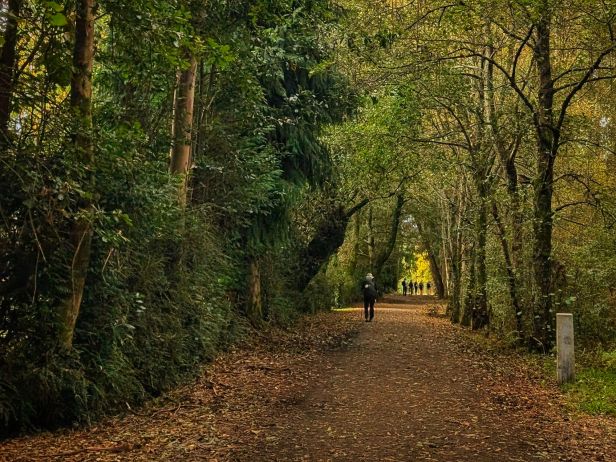 Aus dem Ort hinaus überqueren wir eine Straße und es geht hinein in die Natur auf ein Waldstück zu. Die Gegend hat sich seit letztem Jahr nicht verändert, sie ist nur nasser und deutlich leerer. Ob es daran liegt, dass wegen des schlechten Wetters der letzten Tage weniger Pilger auf dem Weg sind oder ob wir einfach sehr spät dran sind, heute Morgen, lässt sich nicht sagen.