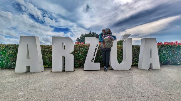 Arzúa empfängt uns in Großbuchstaben, Capital Letters, auf denen man wunderbar erleichtert abhängen kann. Letztes Jahr war Arzúa nur ein Durchgangsort für uns, denn da sind wir die 33 Kilometer gelaufen. Heute ist es das Ziel und erfüllt mich mit Dankbarkeit.
