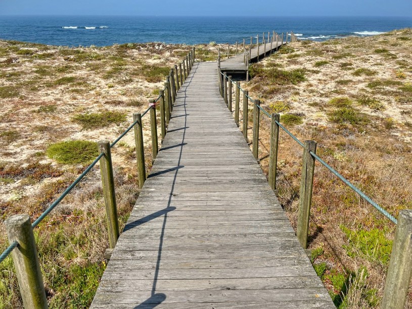 Weiter geht‘s entlang schöner Gärten und über holprige Wege. Ich warte auf‘s Meer und höre es, bevor ich es sehe. Dann öffnet sich hinter einem kleinen Dorf der Blick auf den Atlantik. Darauf haben wir gewartet, das ist unser Leitmotiv für den Jakobsweg 2025 – am Meer entlang laufen. Schweigend genießen wir den Anblick, dann geht es weiter auf Holzstegen, immer mit Blick auf den Strand. Manchmal führt der Weg durch die Dünen. Der Wind ist eher frisch, ich muss eine Jacke anziehen.