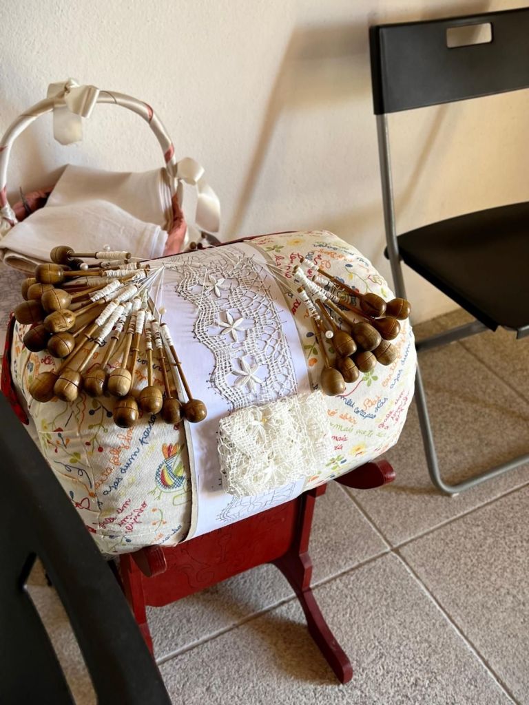 Bevor wir die Brücke passieren, sehen wir einen Mann vor einer kleinen Kirche stehen, vor einem großen Pilgerschild mit der Aufschrift STAMP. Schon kramen wir nach unserem Pilgerpass und erklimmen die Stufen zur Kirche. Während er unsere Pässe stempelt, schaue ich mich um. Die Kirche ist sehr schön dekoriert, mir fallen die vielen Spitzendeckchen auf. Er bemerkt meinen Blick und ruft mich zu sich. Ich verstehe nicht, was er mir sagen will, doch dann zeigt er auf eine Klöppelwalze. Dort entsteht gerade ein neues Spitzenband. Froggy deutet auf ihn und fragt, ob er das macht. Er lacht laut auf und zeigt uns dann ein Bild auf seinem Handy von seiner Frau beim Klöppeln. Man sieht ihm an, wie stolz er auf seine Frau ist, er zeigt uns immer mehr Bilder. Ich erinnere mich, gelesen zu haben, dass in Vila do Conde die Tradition des Klöppelns seit dem 17. Jahrhundert beibehalten wurde. Wir bestaunen noch hinreichend das Werk und machen uns dann auf zu unserer Herberge.