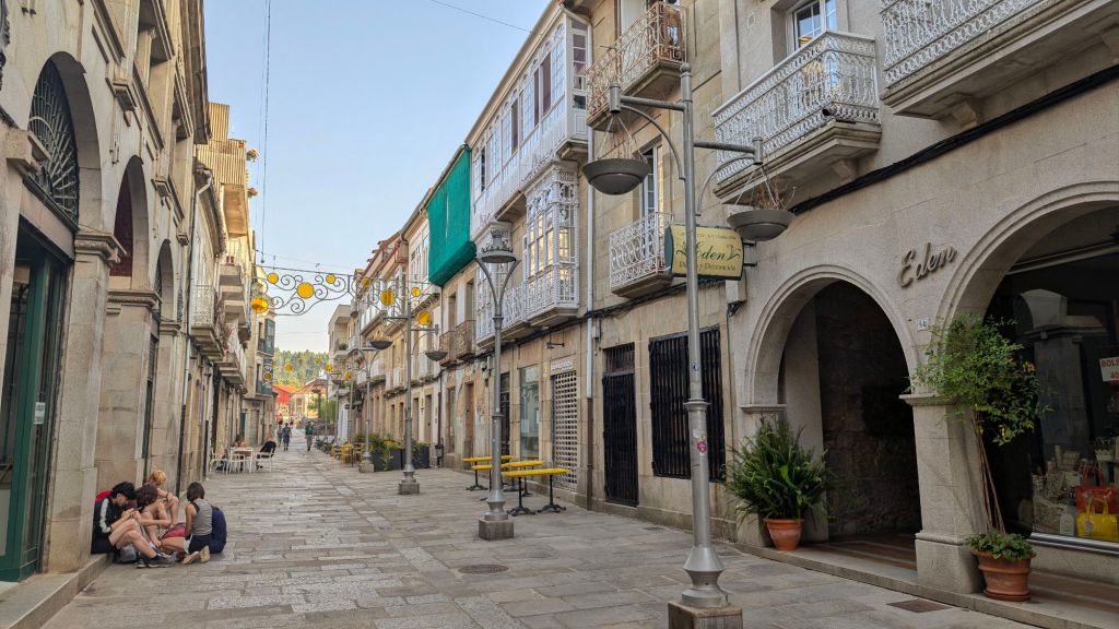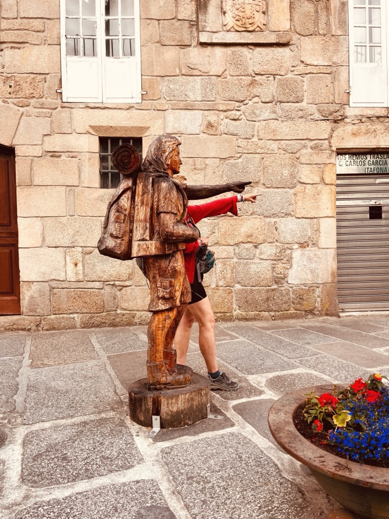 Draußen treffen wir auf einen hölzernen Peregrino, der uns den Weg weist. Wir hoffen, dass er an einem geöffneten Lokal vorbeiführt. Eine Gruppe jugendlicher Pilger sitzt auf dem Gehsteig; es werden Blasenpflaster verteilt. Ich finde es erstaunlich, wie viele sehr junge Menschen auf dem Pilgerweg sind – auch Familien mit kleinen und großen Kindern, selbst mit erwachsenen Kindern. Gerade bei den Italienern scheint der Jakobsweg eine Art Familienprojekt zu sein, das jedes Jahr angegangen wird.