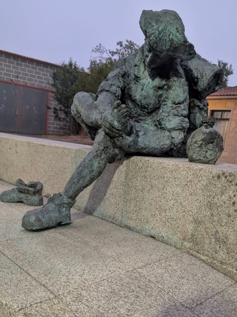 Vor der Herberge „Albergue de Peregrinos de O Pino“ sitzt die Statue eines Pilgers, der sich die Füße versorgt. Und das ist so ziemlich das Spektakulärste, was die Herberge zu bieten hat.